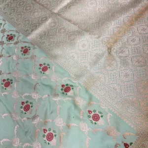 The highlight of this saree is its intricately designed zari border, adorned with delicate geometric and floral detailing that reflects fine traditional craftsmanship. Lightweight yet lustrous, this Mashru silk saree is ideal for weddings, festivals, receptions, and grand celebrations.