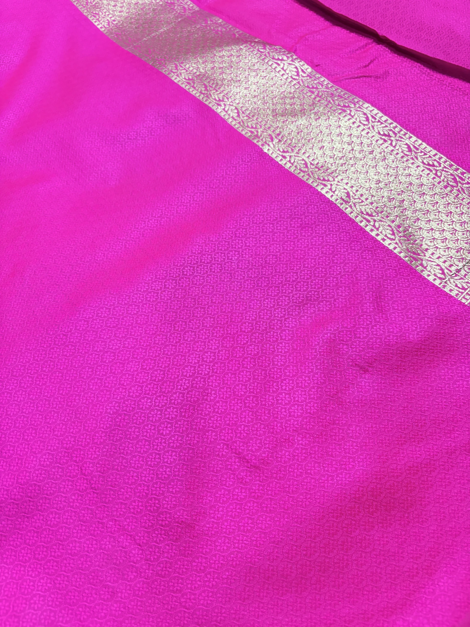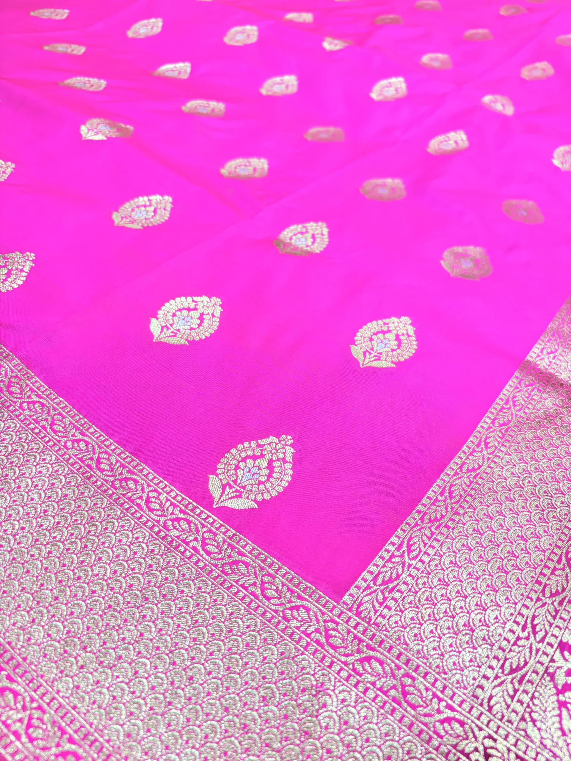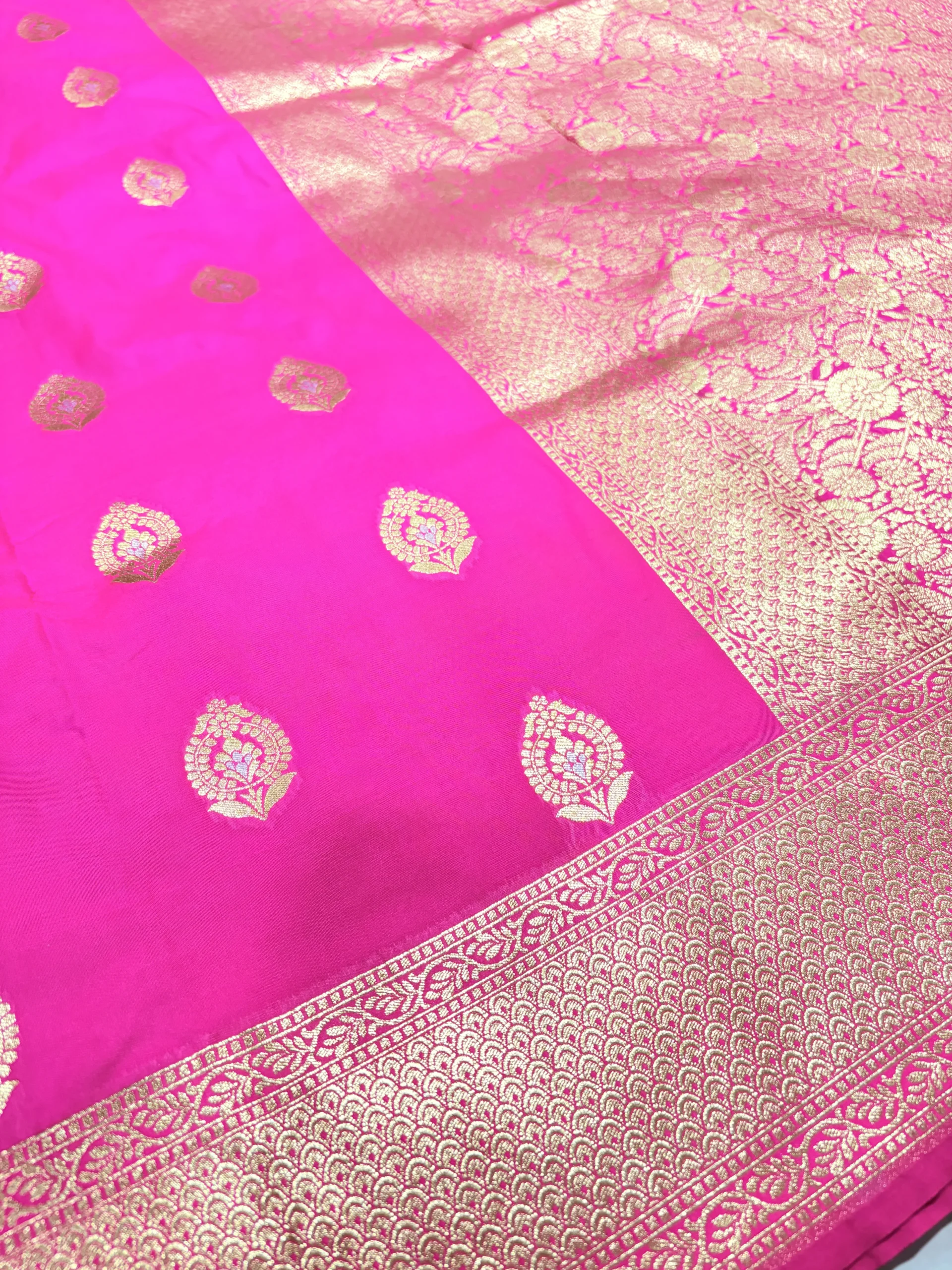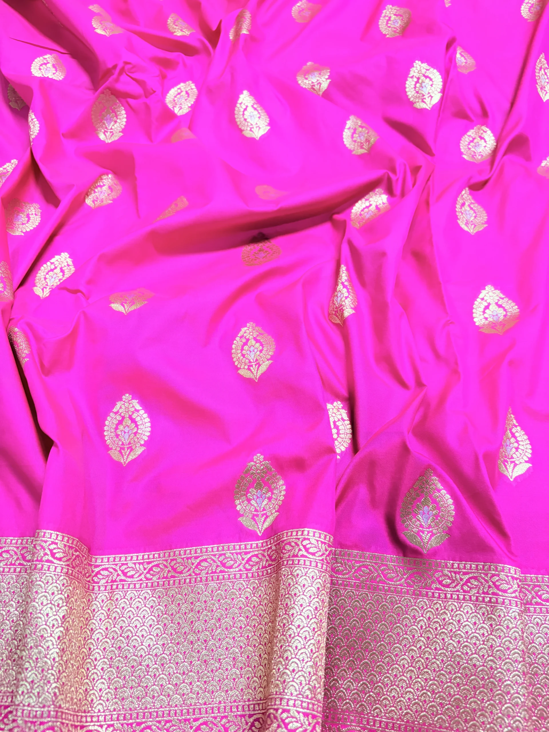 Turn heads with this captivating Hot Pink Mashru Silk Saree, crafted to perfection with a luxurious sheen and smooth, elegant drape. The saree features beautifully woven gold zari paisley buta motifs scattered gracefully across the body, adding richness and traditional charm to its vibrant, festive hue.