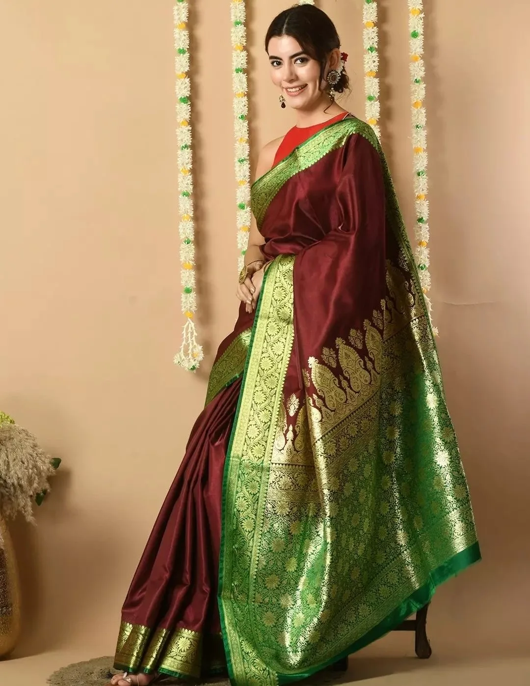 Colour: Maroon body with green zari border & pallu