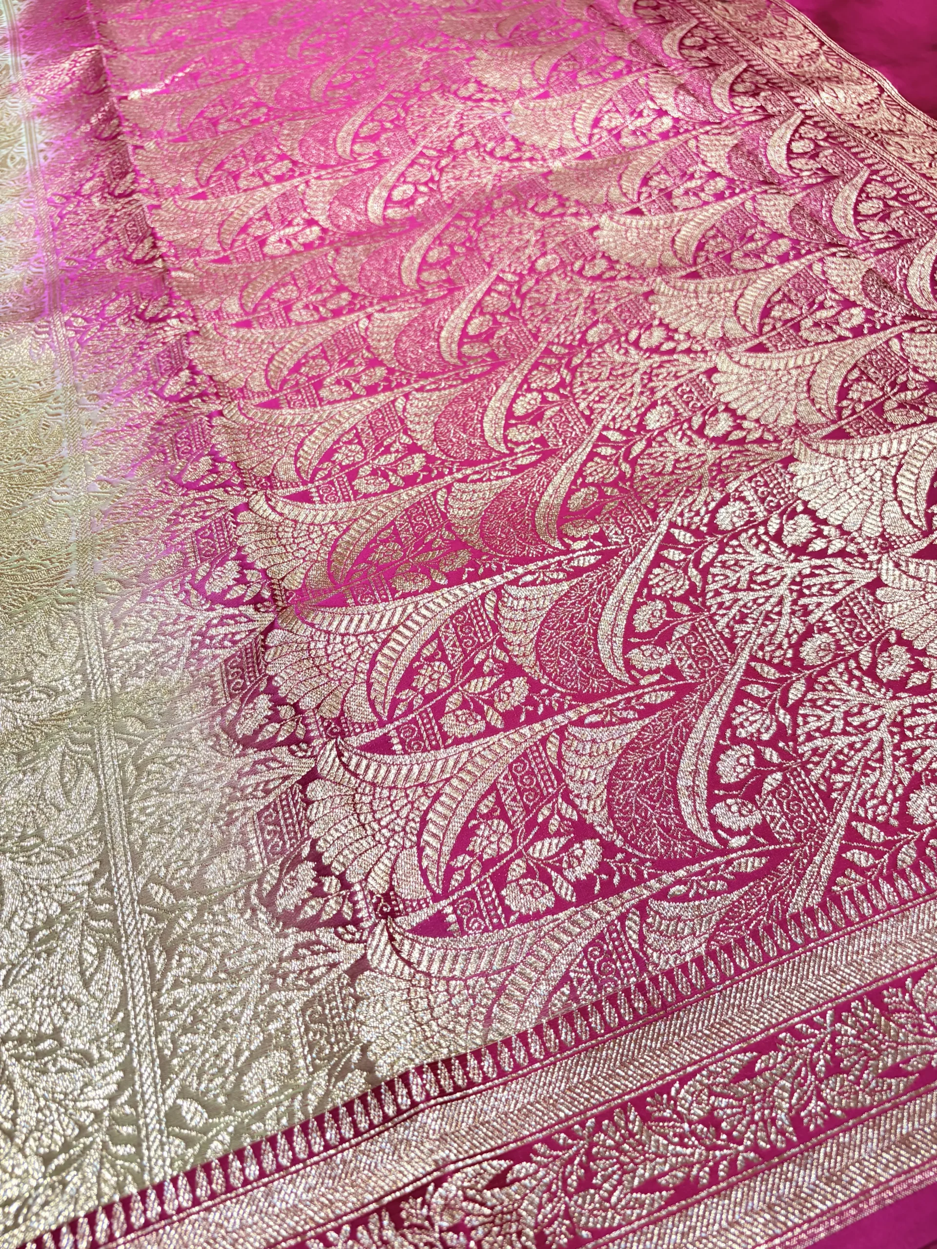 Adorned with all-over golden zari buttas, the body glows with delicate detailing, while the striking contrast pink border with intricate floral zari weaving adds a captivating pop of colour. The grand pallu completes the masterpiece, elevating your festive and wedding style with sophistication.
