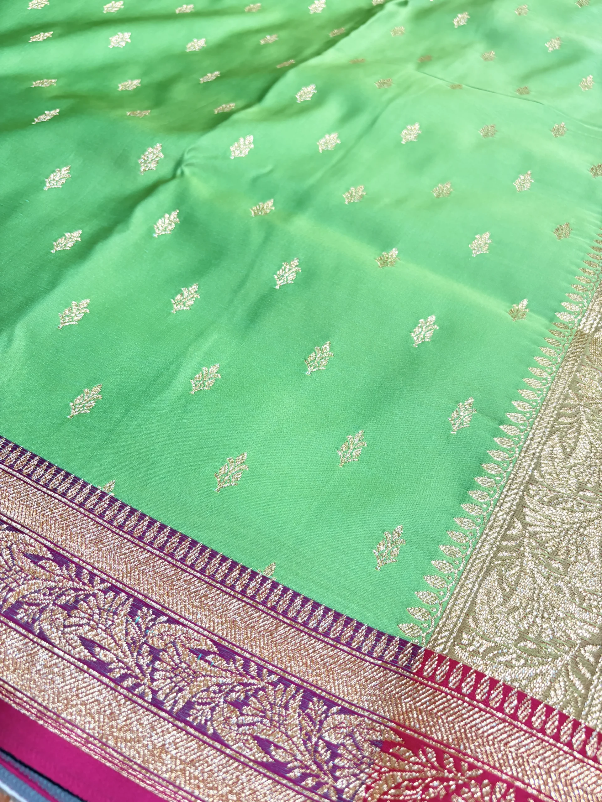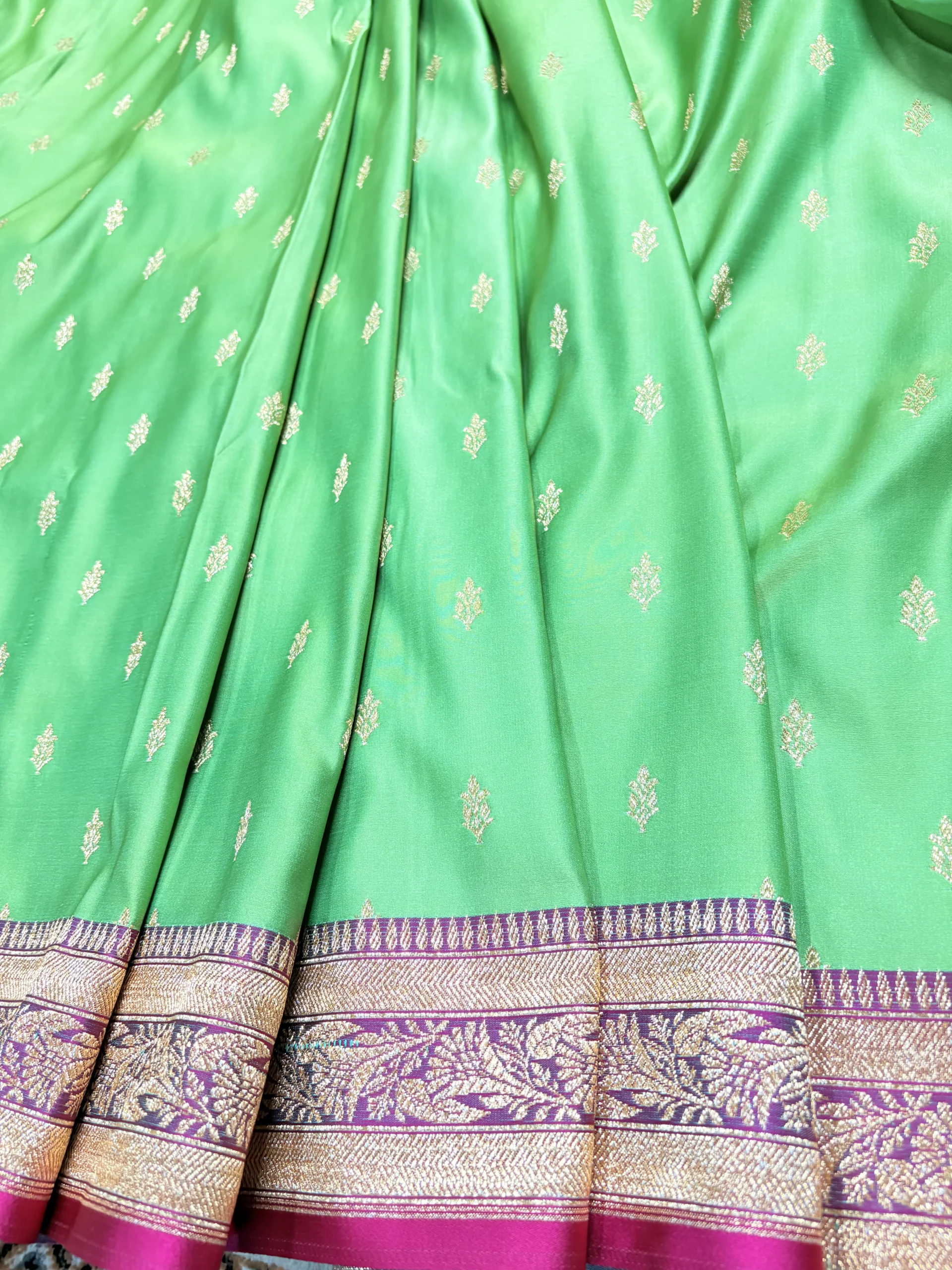 Step into a world of elegance and celebration with this Mint Green Mashru Silk Saree, a luxurious blend of traditional craftsmanship and modern charm. The silky-smooth Mashru fabric drapes beautifully with a natural sheen, giving the saree an effortlessly regal fall.