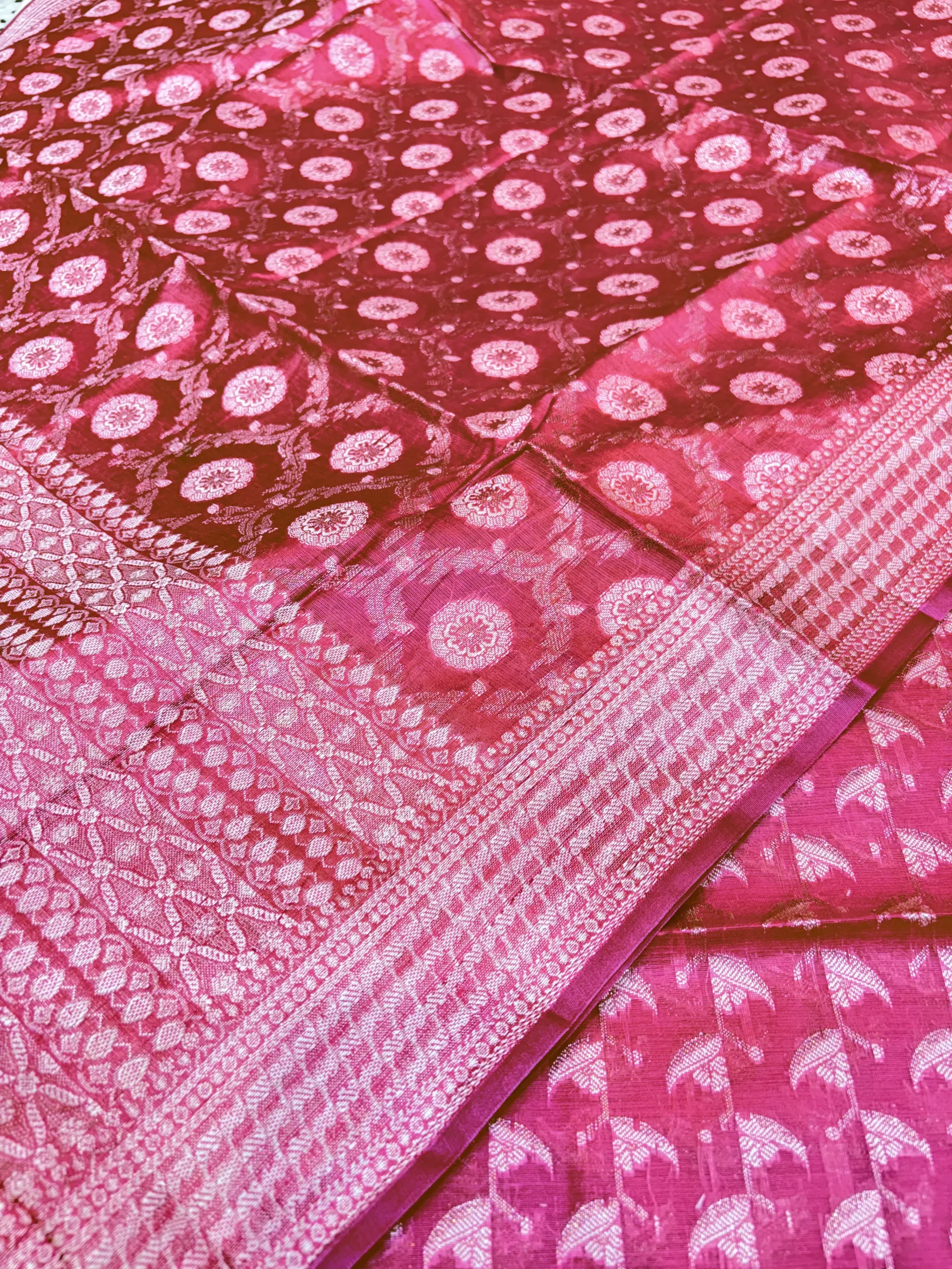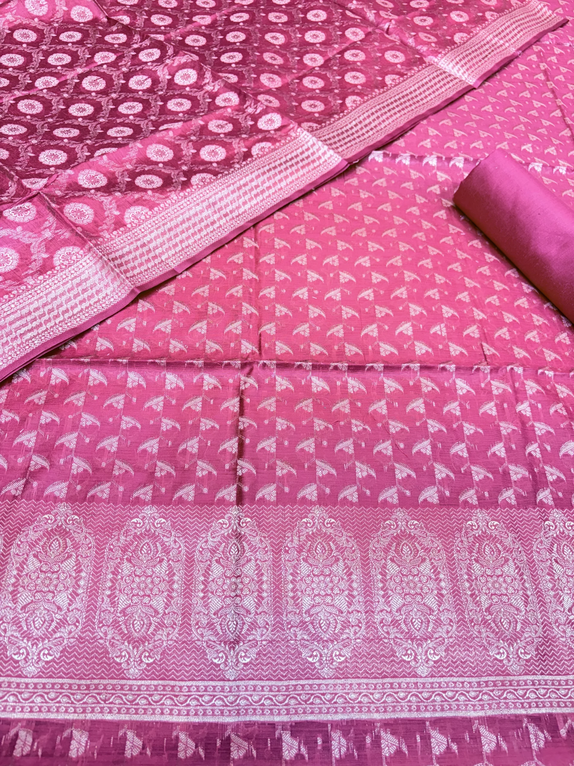 Step into timeless grace with this stunning Pure Mercerised Cotton Banarasi Suit, drenched in a rich rani pink hue and adorned with luxurious resham weaving throughout. The traditional motifs and finely crafted Banarasi border add a royal touch, making this ensemble a perfect choice for festive celebrations and special occasions.