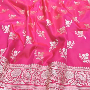 Rani Pink Katan Silk Saree with Silver Zari Flower Boota & Intricate Border