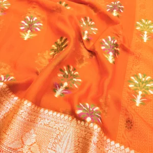 Pure Khaddi Chiffon Saree – Orange Banarasi Weave with Mini Buti & Intricate Zari Border